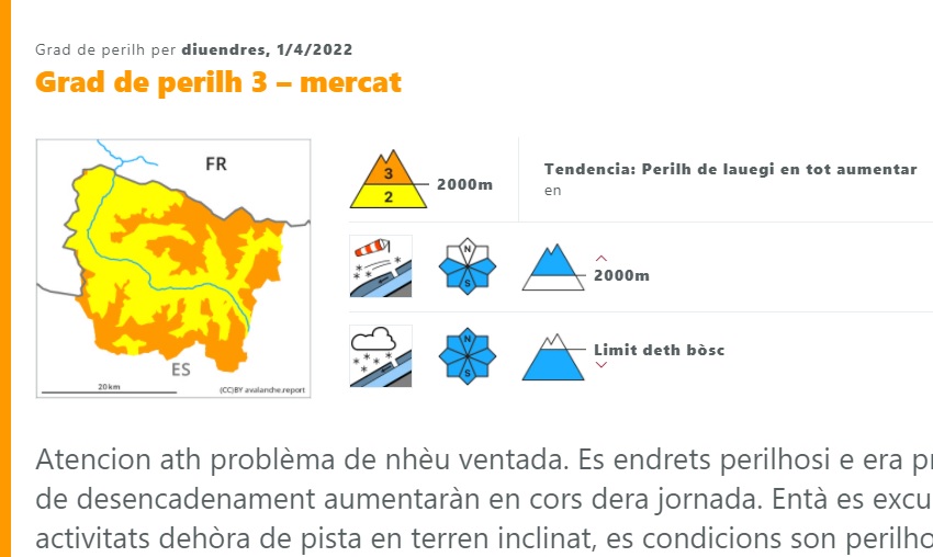 Dichos boletines informan sobre el grado de peligro de avalanchas y su rango de alcance, descripción del riesgo, análisis del manto de nieve y una tendencia de comportamiento válida durante las siguientes 24 o 48 horas. Estos datos son especificados en el Valle de Arán según tres regiones: Arán norte y centro, límite sur y vertiente sur.